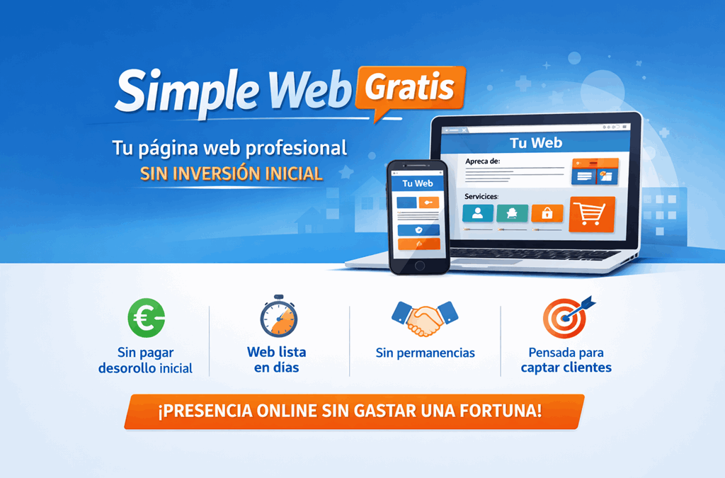 marzo 17, 2026Simple Web Gratis es un servicio que te permite disponer de una página web profesional sin pagar desarrollo inicial. Solo abonas el alojamiento anual, sin permanencias ocultas ni costes sorpresa.